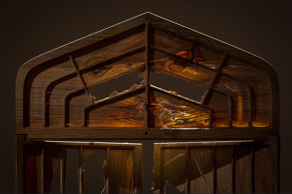Un bosque en ruinas, de Juan Rey, es una instalación que presenta una serie de réplicas a escala de las aberturas de antiguas usinas eléctricas, construidas con maderas recuperadas del bosque. Al desprenderse de su contexto original, estas puertas y ventanas se transforman en piezas autónomas que adquieren la solemnidad de un pequeño altar.
